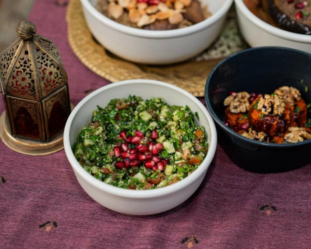Bedeutet: Auch hier liegt unser Fokus auf vegetarischen und veganen Gerichten, so wie man sie aus Aleppo kennt – frisch, gesund und mit viel Geschmack.